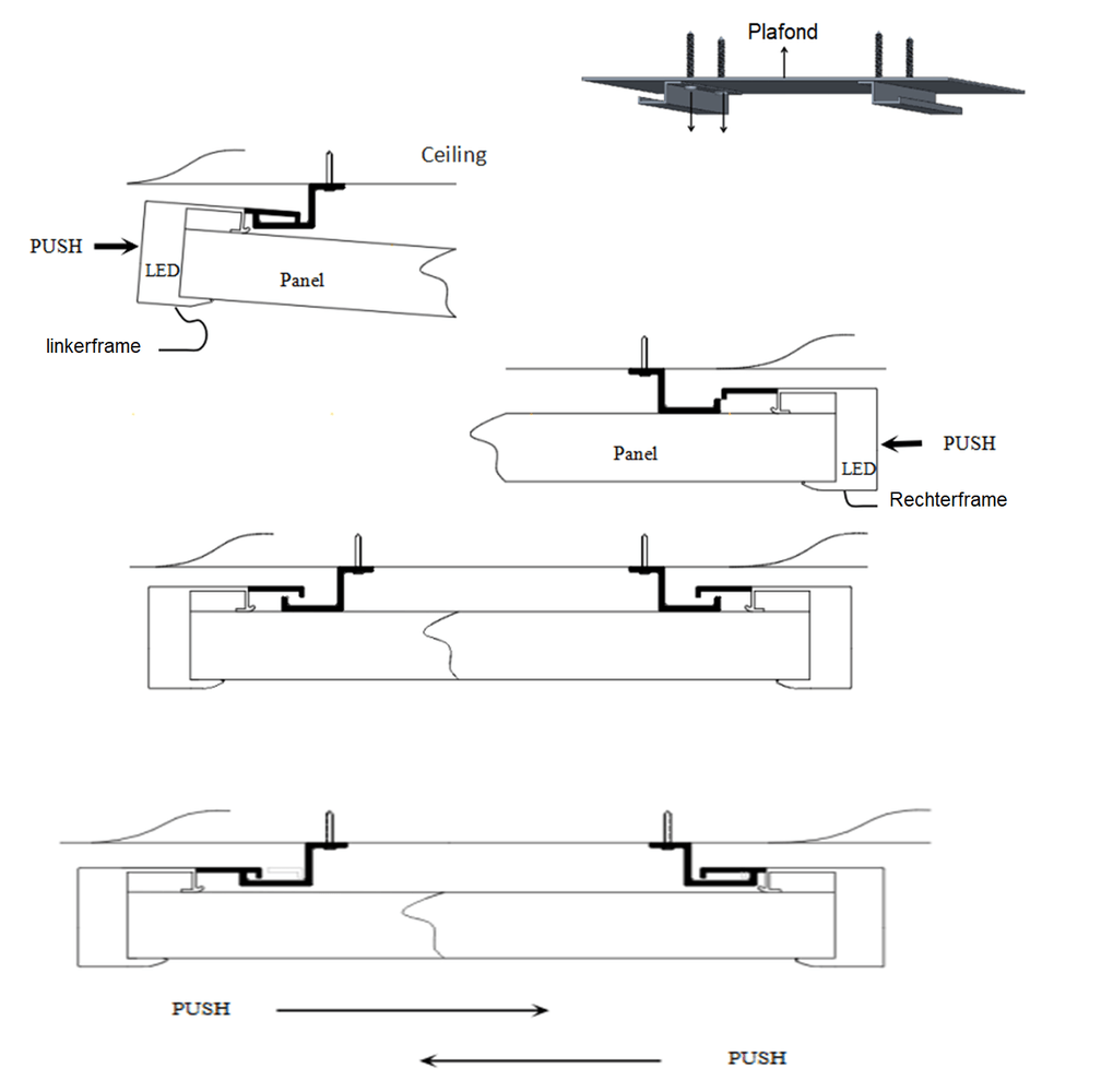 Het VH infraroodpaneel serie HH met LED verlichting mag enkel gemonteerd worden aan het plafond. Het paneel wordt geleverd met beugels, benodigd installatiemateriaal en installatiehandleiding. Hang vervolgens het paneel aan deze beugels door het paneel er volgens de instructies in te kantelen. Plaatsing aan een rechte of schuine wand is bij dit paneel niet toegestaan.